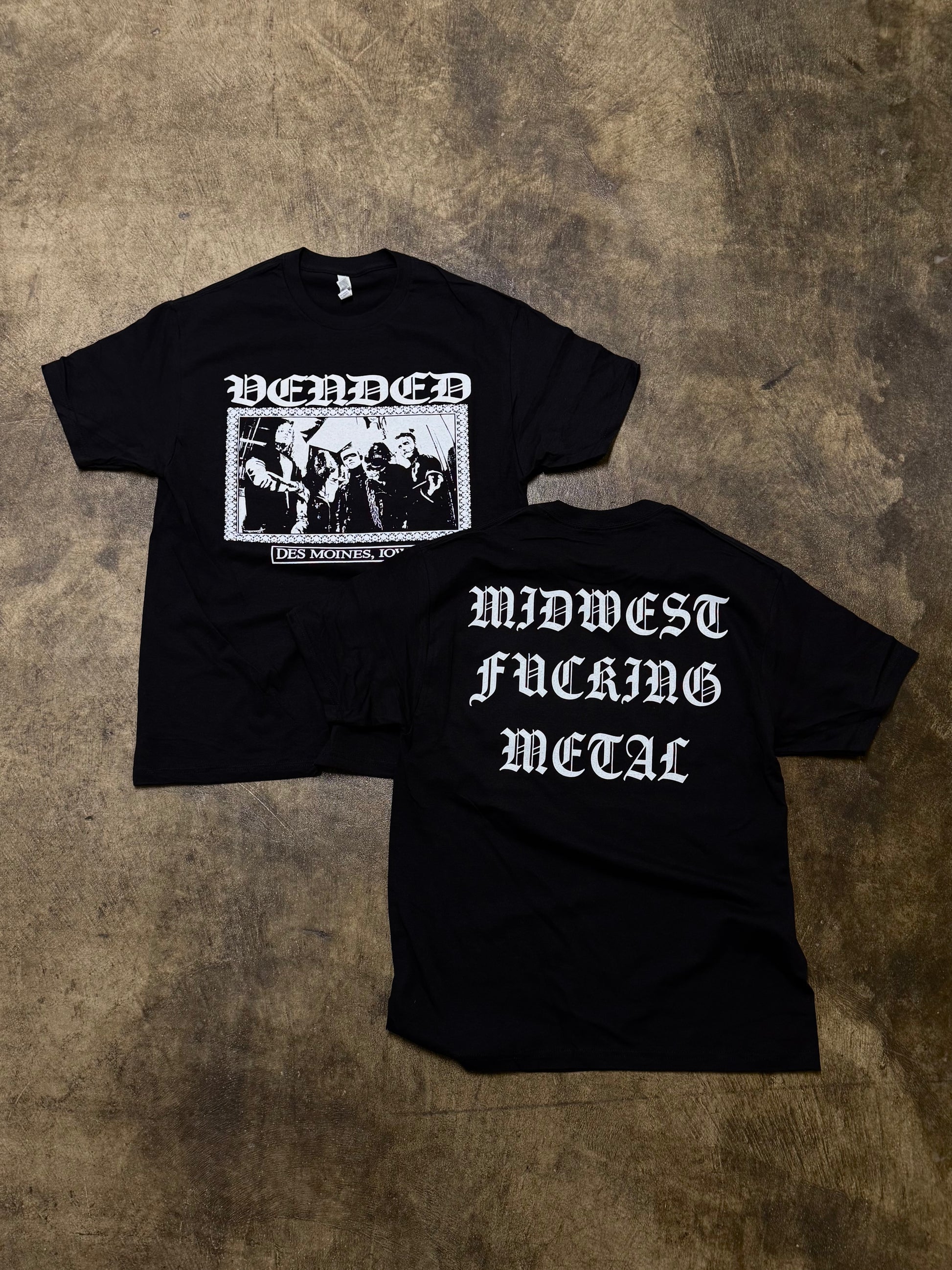 Vended's "Midwest Fucking Metal" design, printed on the front and back of an American Apparel